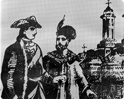 Дмитрий Кантемир и Петр I в Яссах, 1711 год. Гравюра, 18 векВ своем воззвании к стране Дмитрий Кантемир призывает всех жителей сражаться на стороне армии царя Петра Великого, чтобы устранить османское господство.