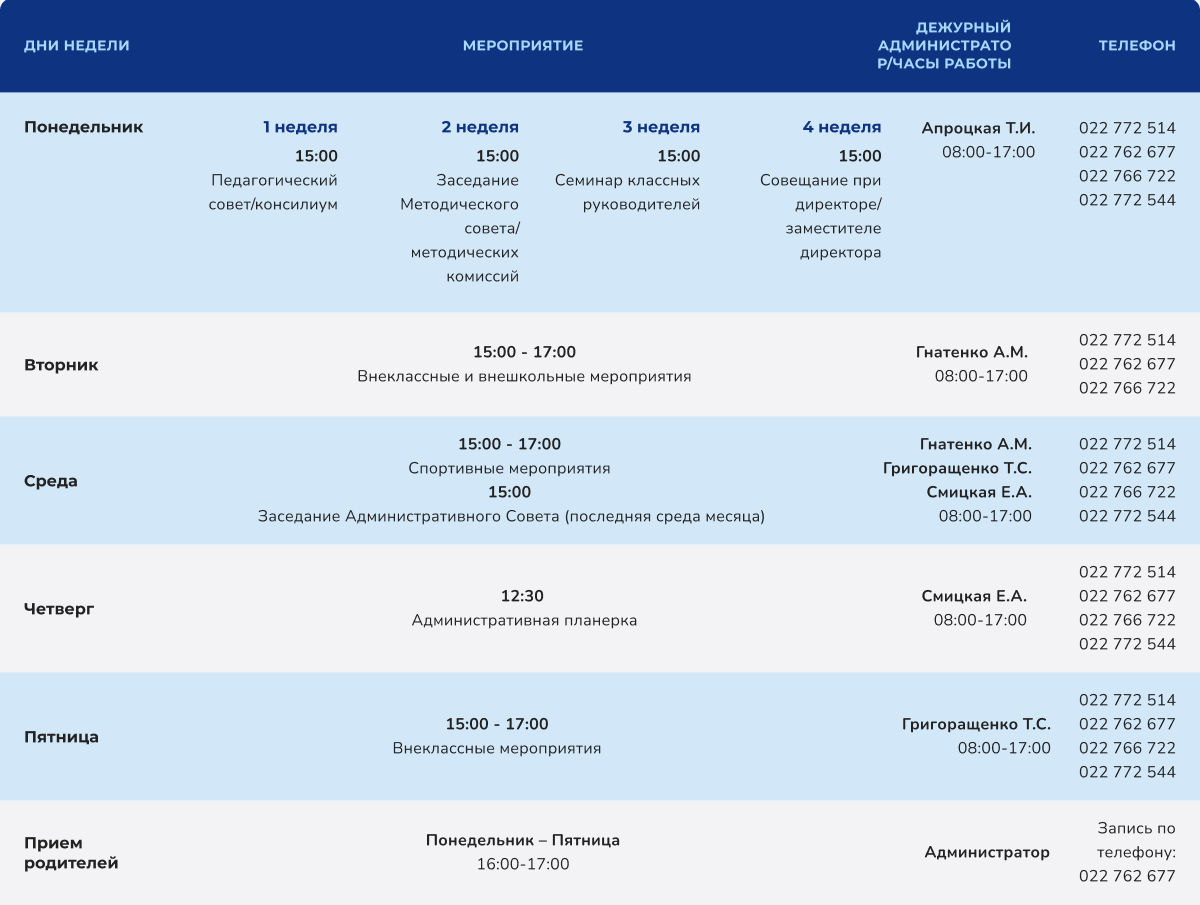 | ДНИ НЕДЕЛИ | МЕРОПРИЯТИЕ | ДЕЖУРНЫЙ АДМИНИСТРАТОР/ ЧАСЫ РАБОТЫ |
