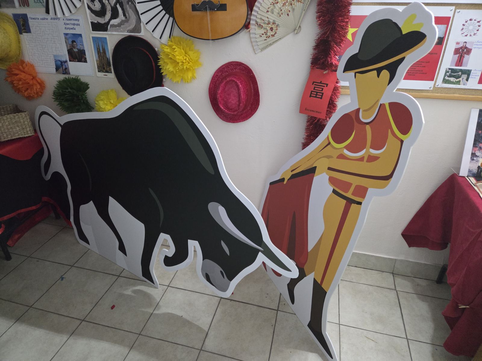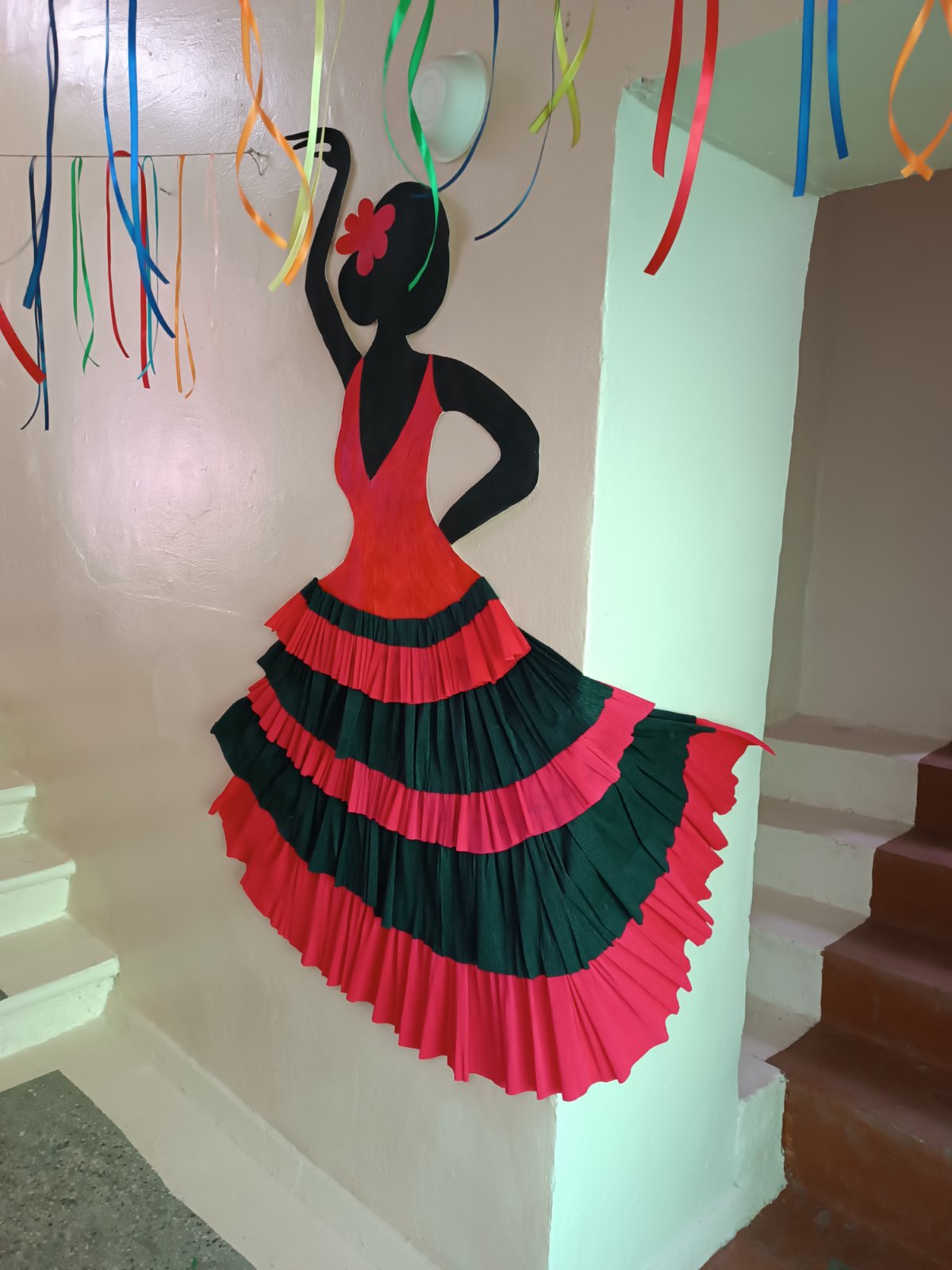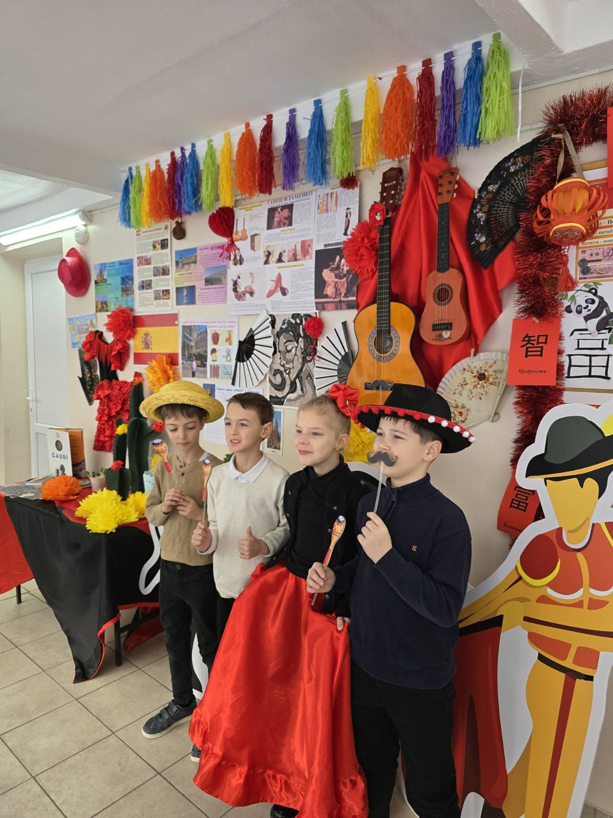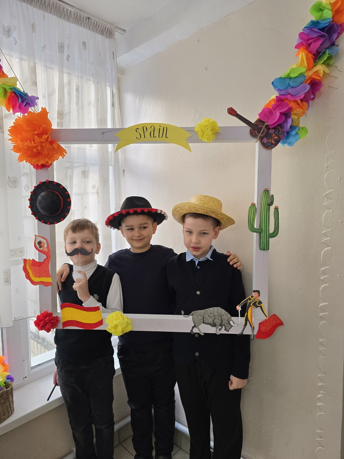 Настоящим украшением дня стала яркая фотозона в испанском стиле, оформленная с использованием национальных символов и декоративных элементов. Дети с удовольствием фотографировались, примеряли шляпы, усы и костюмы, сохраняя на память тёплые и радостные моменты праздника.