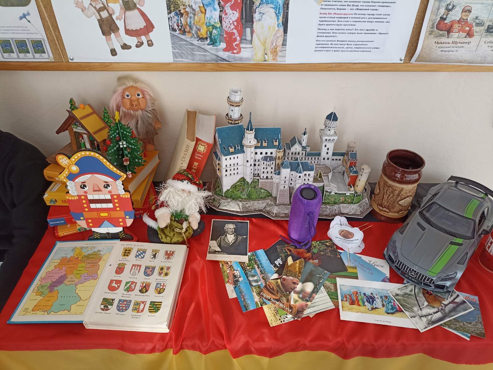 В освещенном солнцем школьном коридоре - красочный стенд, словно окно в Германию, с ее легендарными достопримечательностями. Рядом - выставка, подготовленная учениками и родителями 1 «А» класса.