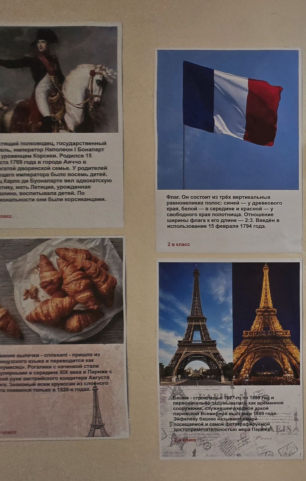 В нашей школе была организована познавательная выставка плакатов, посвящённая Франции — одной из самых самобытных и известных стран Европы. Экспозиция помогла учащимся расширить кругозор и узнать много нового о культуре, истории и традициях французского народа.