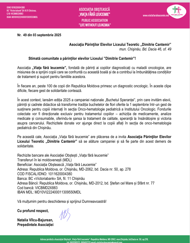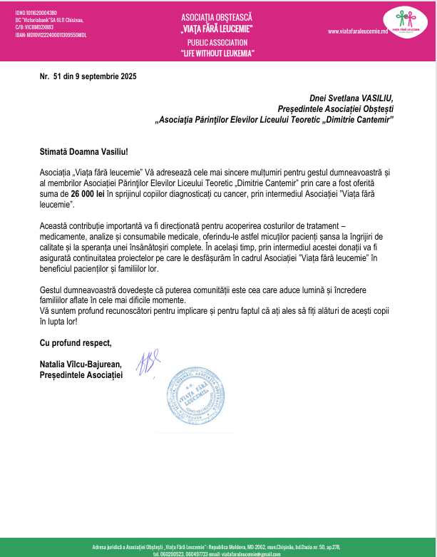 - 26 000 леев были переданы в фонд «Viață fără leucemie», с которым наш Лицей сотрудничает уже не первый год;