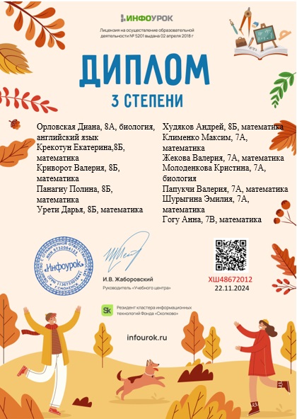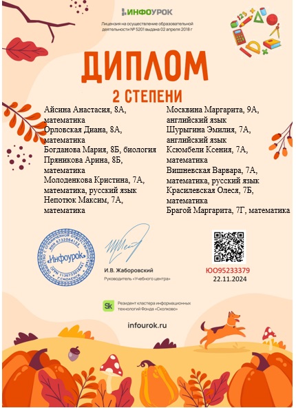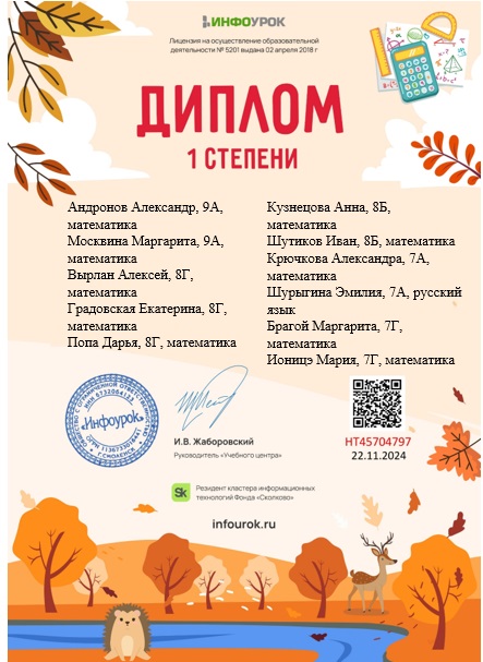 Поздравляем участников и победителей Международной олимпиады проекта «Инфоурок», осенний сезон 2024